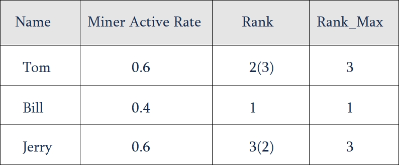 Verified-Storage Provider Active Deal Rate = the number of active deals/numbers of total deals After Web3 Storage Providers (W3SP) are ranked by the calculated verified Web3 Storage Provider (W3SP) active rate in increasing order with the method set to "max". In other words, the records that have the same values are ranked using the highest rank (e.g.: If ‘Tom’ and ‘Jerry' are tied in the 2nd and 3rd position with the same value, rank 3 is assigned to them both).